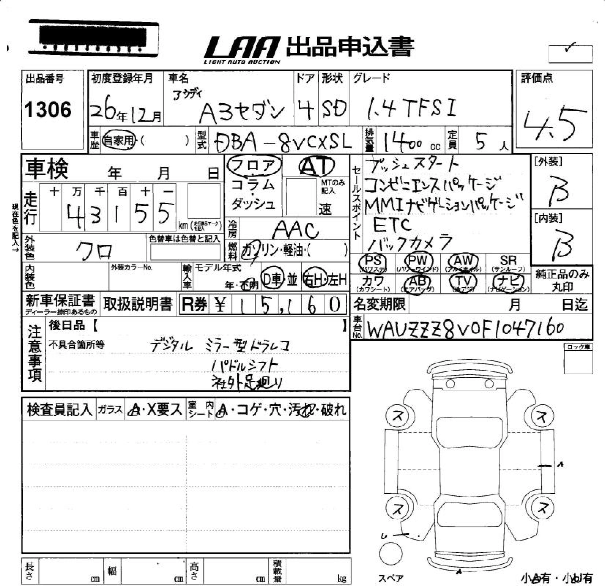 | 1.4 TFSI | DBA-8VCXSL | CXS | FF | 7AT | 1394cc | 122ps(90kW)/5000~6000rpm | AИ-95 | 3 340 000 |