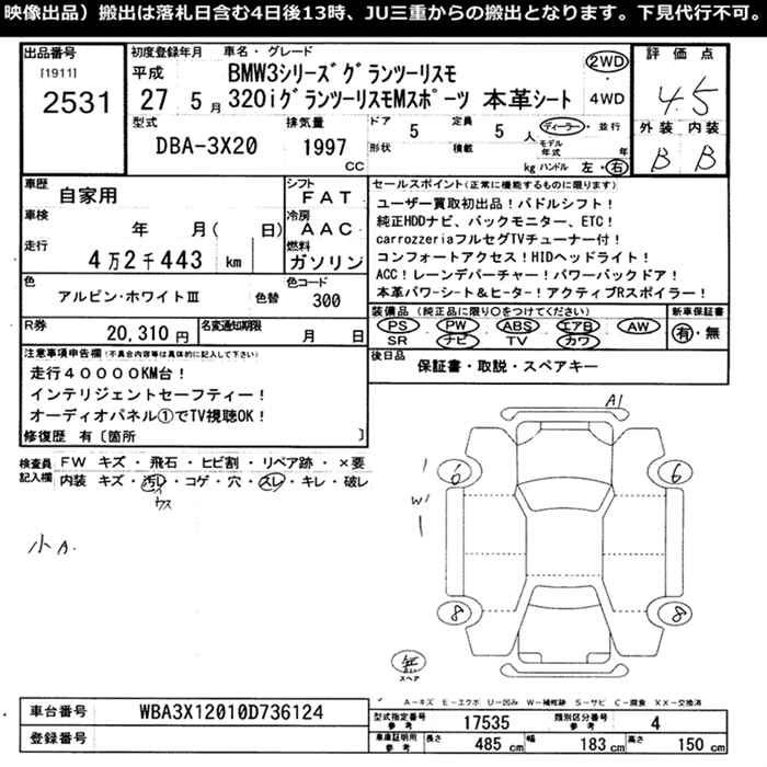 320i GRAN TURISMO SPORT DBA-3X20 N20B20B FR 8AT 1997cc 184ps(135kW)/5000rpm AИ-95 5 520 000