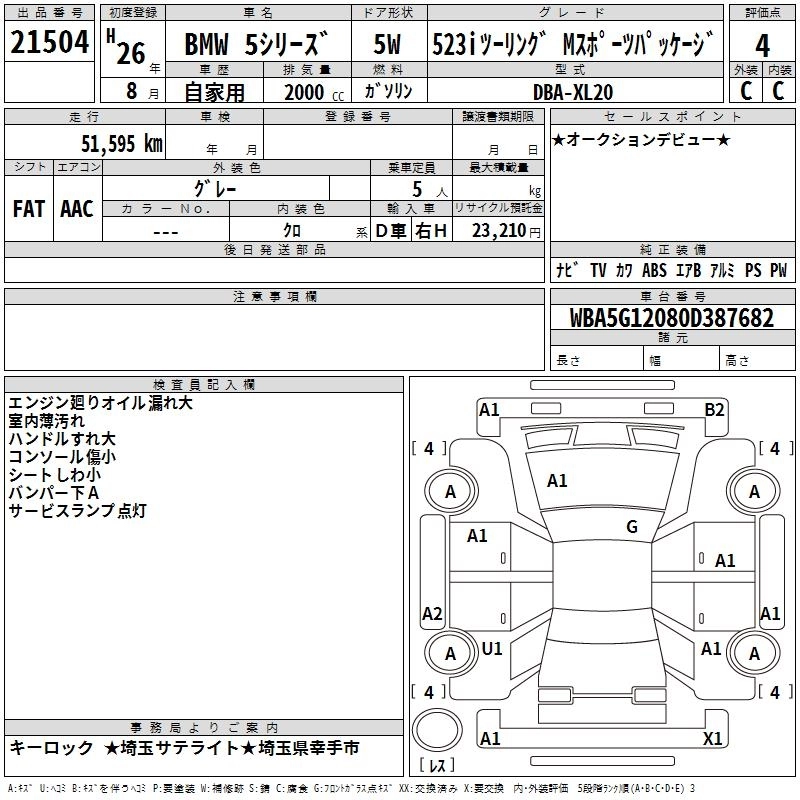| 528i TOURING M-SPORT | DBA-XL28 | N20B20A | FR | 8AT | 1997cc | 245ps(180kW)/5000rpm | AИ-95 | 7 730 000 | |