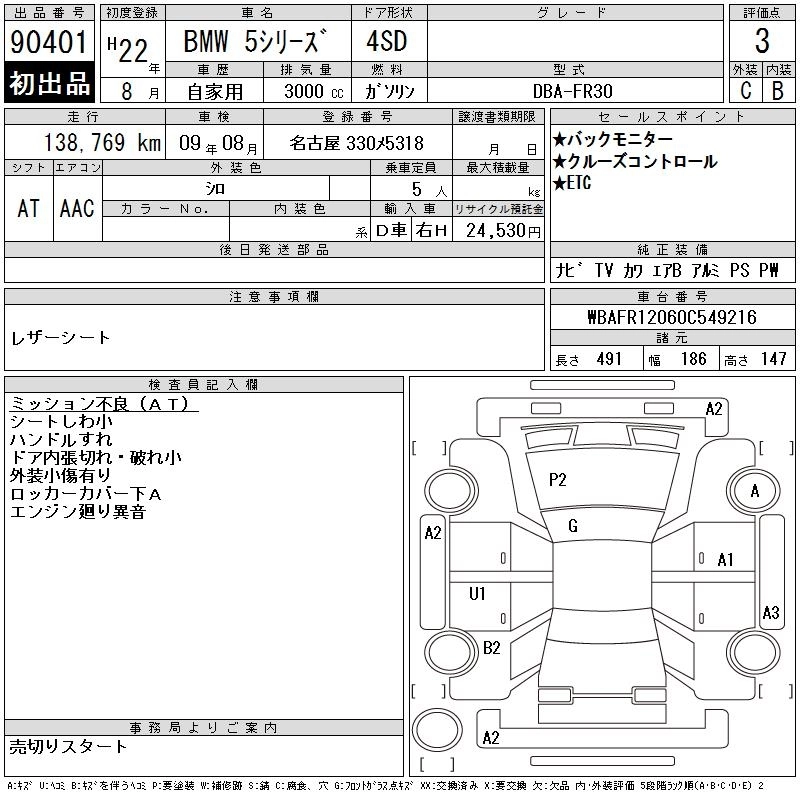 | 528i TOURING | DBA-MU30 | N52B30A | FR | 8AT | 2996cc | 258ps(190kW)/6600rpm | AИ-95 | 7 450 000 | |