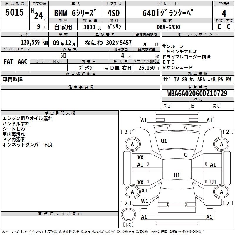 | 640i COUPE | DBA-LW30C | N55B30A | FR | 8AT | 2979cc | 320ps(235kW)/5800rpm | AИ-95 | 9 350 000 | |