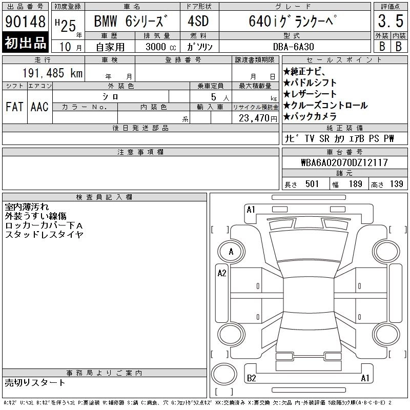 | 640i GRAN COUPE | DBA-6A30 | N55B30A | FR | 8AT | 2979cc | 320ps(235kW)/5800rpm | AИ-95 | 9 960 000 | |