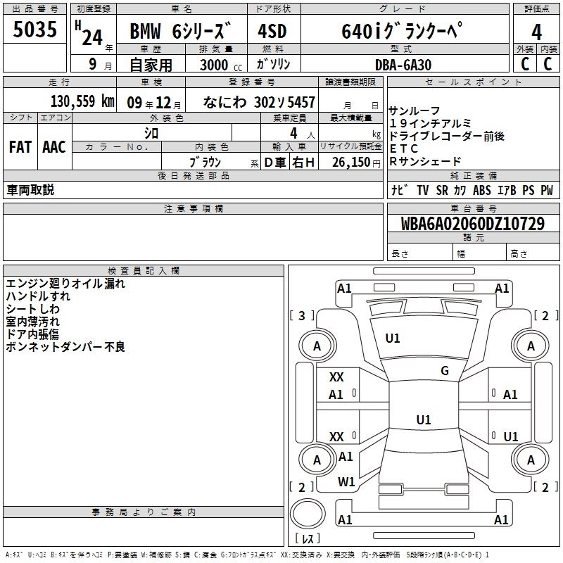 | 640i GRAN COUPE | DBA-6A30 | N55B30A | FR | 8AT | 2979cc | 320ps(235kW)/5800rpm | AИ-95 | 9 860 000 | |