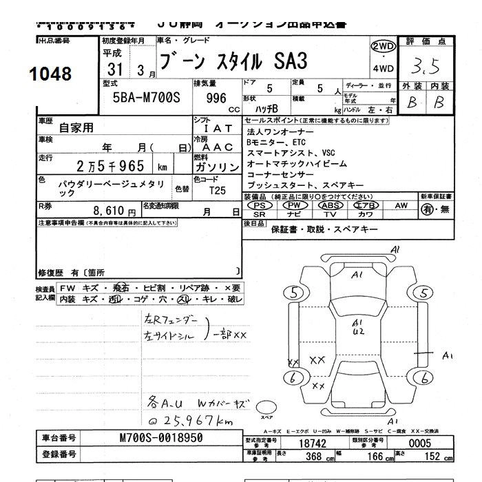 | X SA III | 5BA-M700S | 1KR-FE | FF | CVT | 996cc | 69ps(51kW)/6000rpm | AИ-92 | 1 265 000 | |