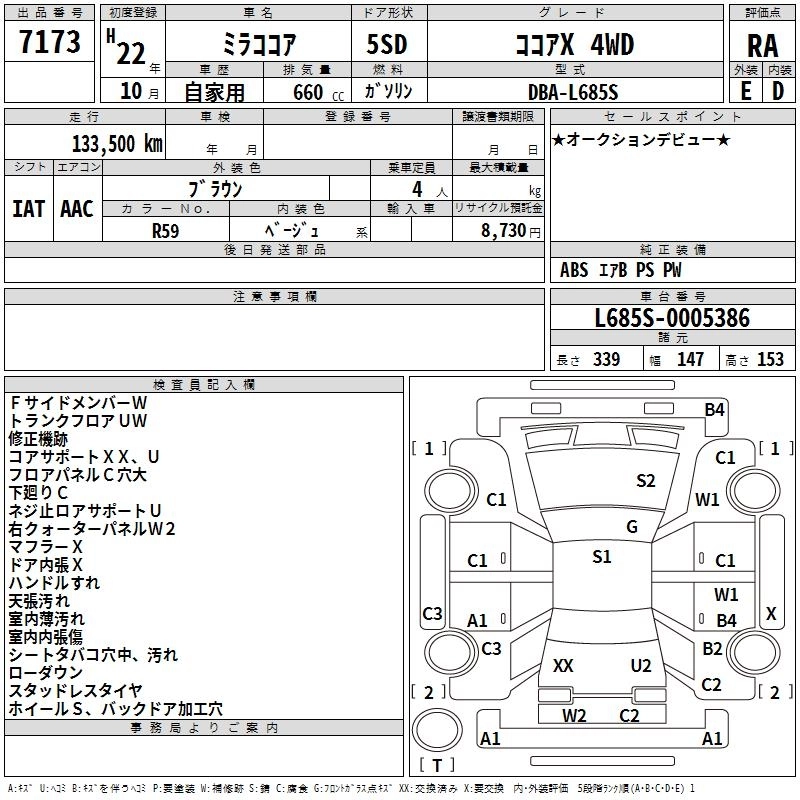 | COCOA X | DBA-L685S | KF-VE | Full-time 4WD | CVT | 658cc | 58ps(43kW)/7200rpm | AИ-92 | 1 337 000 | |