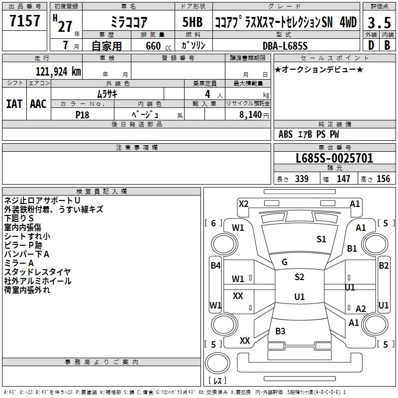| COCOA PLUS X LIMITED | DBA-L685S | KF | Full-time 4WD | CVT | 658cc | 52ps(38kW)/6800rpm | AИ-92 | 1 652 400 | |
