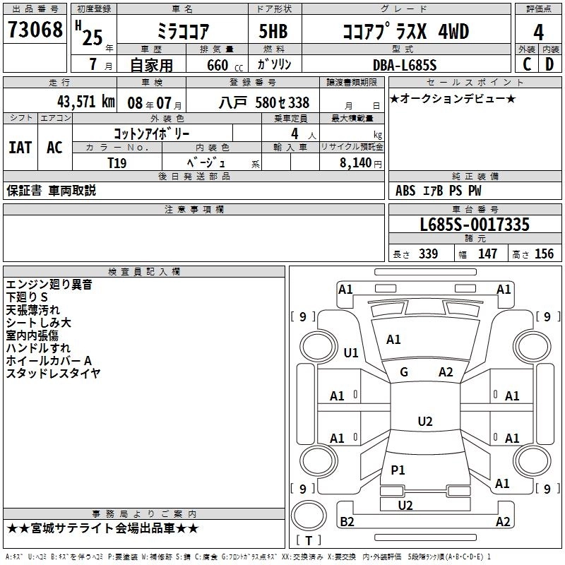| COCOA PLUS X SPECIAL CORDE | DBA-L675S | KF | FF | CVT | 658cc | 52ps(38kW)/6800rpm | AИ-92 | 1 300 000 | |