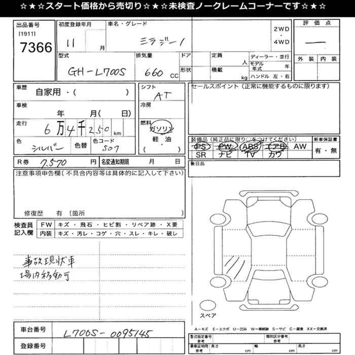 | GINO | GF-L710S | EF-VE | Full-time 4WD | 5MT | 659cc | 58ps(43kW)/7600rpm | AИ-92 | 1 023 000 |