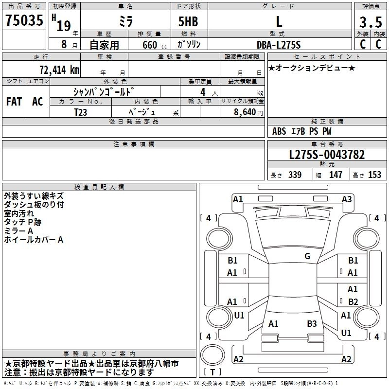 | L SELECTION | DBA-L275S | KF-VE | FF | 5MT | 658cc | 58ps(43kW)/7200rpm | AИ-92 | 882 000 | |