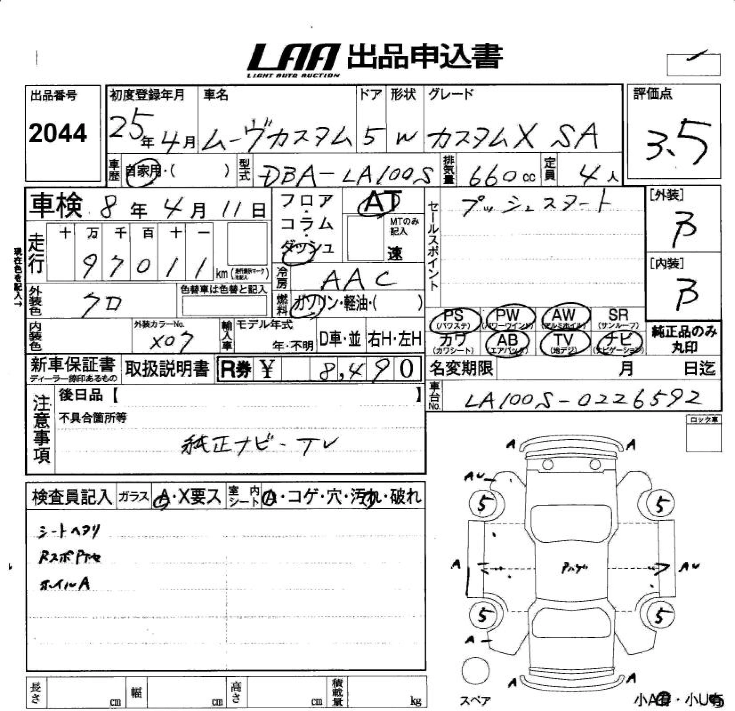 | X SA | DBA-LA100S | KF | FF | CVT | 658cc | 52ps(38kW)/6800rpm | AИ-92 | 1 250 000 | |