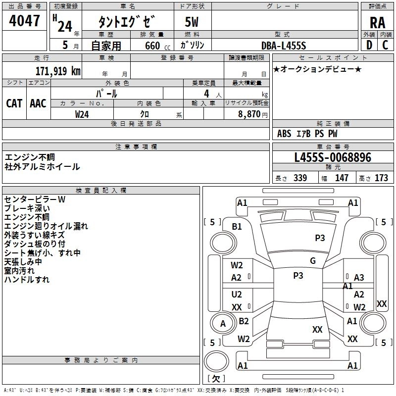 | X | DBA-L455S | KF | FF | CVT | 658cc | 52ps(38kW)/6800rpm | AИ-92 | 1 250 000 | |