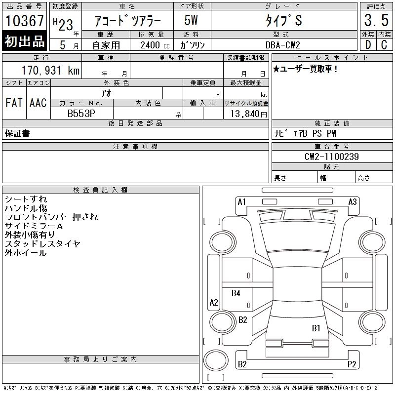 TYPE S DBA-CW2 K24A FF 5AT 2354cc 206ps(151kW)/7000rpm AИ-95 3 860 000