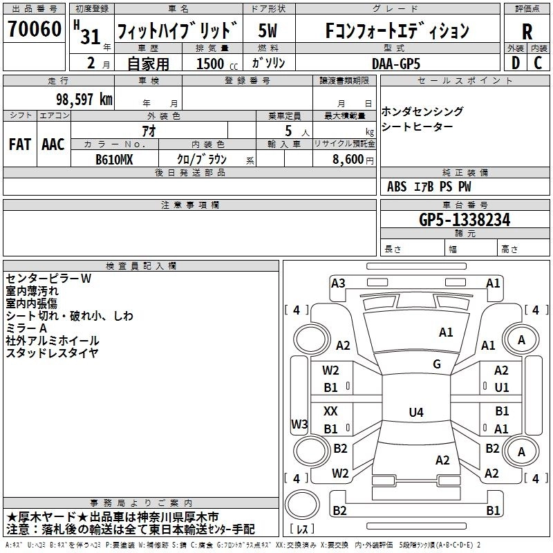 | BASEGRADE | DAA-GP5 | LEB | FF | 7AT | 1496cc | 110ps(81kW)/6000rpm | AИ-92 | 1 731 400 |