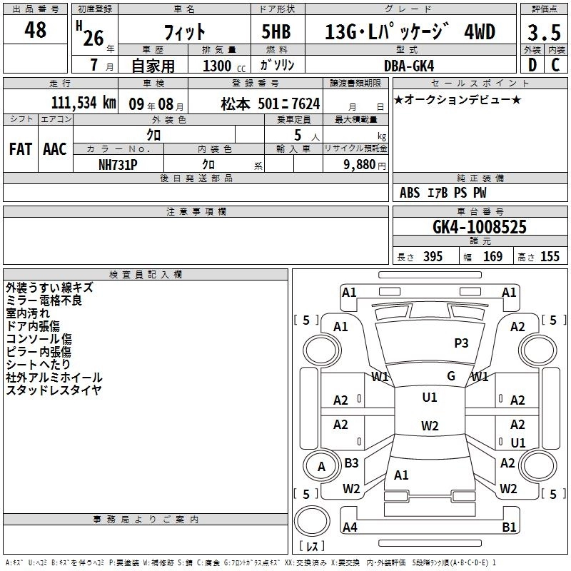 | 13G F PACKAGE | DBA-GK3 | L13B | FF | CVT | 1317cc | 100ps(73kW)/6000rpm | AИ-92 | 1 420 000 | |