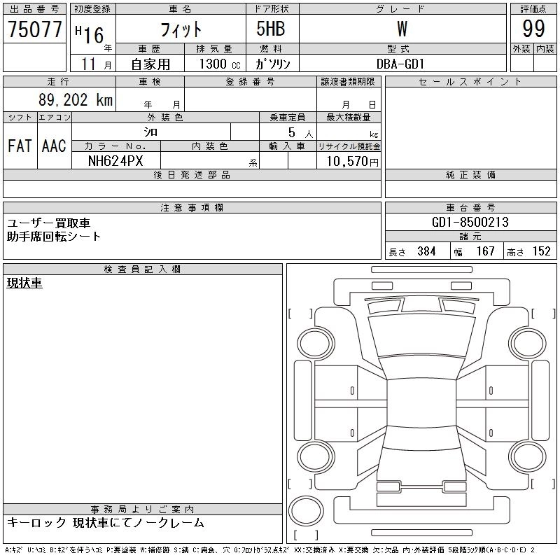 | W | DBA-GD1 | L13A | FF | CVT | 1339cc | 86ps(63kW)/5700rpm | AИ-92 | 1 285 000 | |