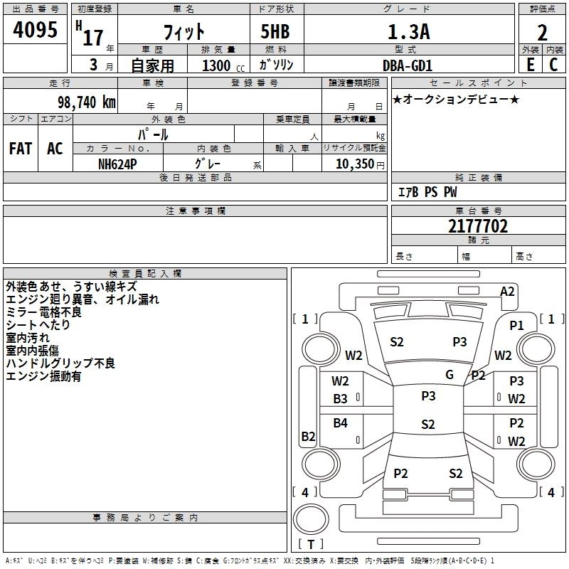 | 1.3A | DBA-GD1 | L13A | FF | CVT | 1339cc | 86ps(63kW)/5700rpm | AИ-92 | 1 186 500 | |