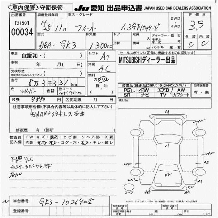 | 13G F PACKAGE | DBA-GK3 | L13B | FF | 5MT | 1317cc | 100ps(73kW)/6000rpm | AИ-92 | 1 360 000 | |