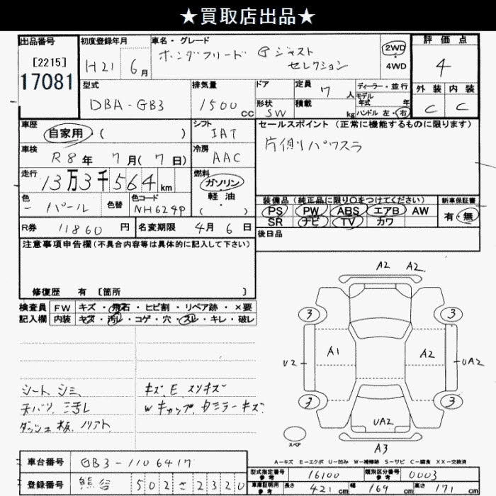 | GI AERO | DBA-GB3 | L15A | FF | CVT | 1496cc | 118ps(87kW)/6600rpm | AИ-92 | 2 266 000 | |
