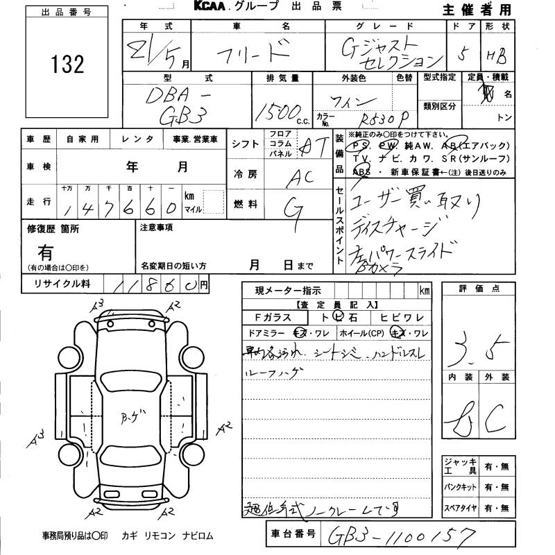 | G AERO JUST SELECTION | DBA-GB3 | L15A | FF | CVT | 1496cc | 118ps(87kW)/6600rpm | AИ-92 | 2 020 000 | |