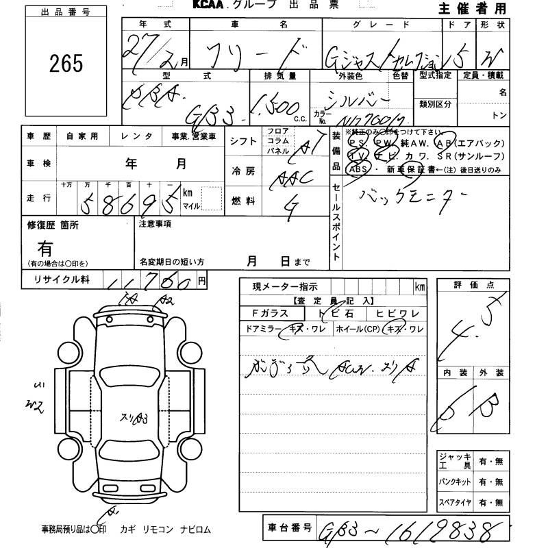 HONDA FREED 2015 г., лот № 265