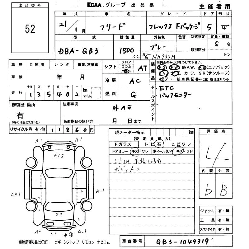 G AERO DBA-GB4 L15A Full-time 4WD 5AT 1496cc 118ps(87kW)/6600rpm AИ-92 2 104 000