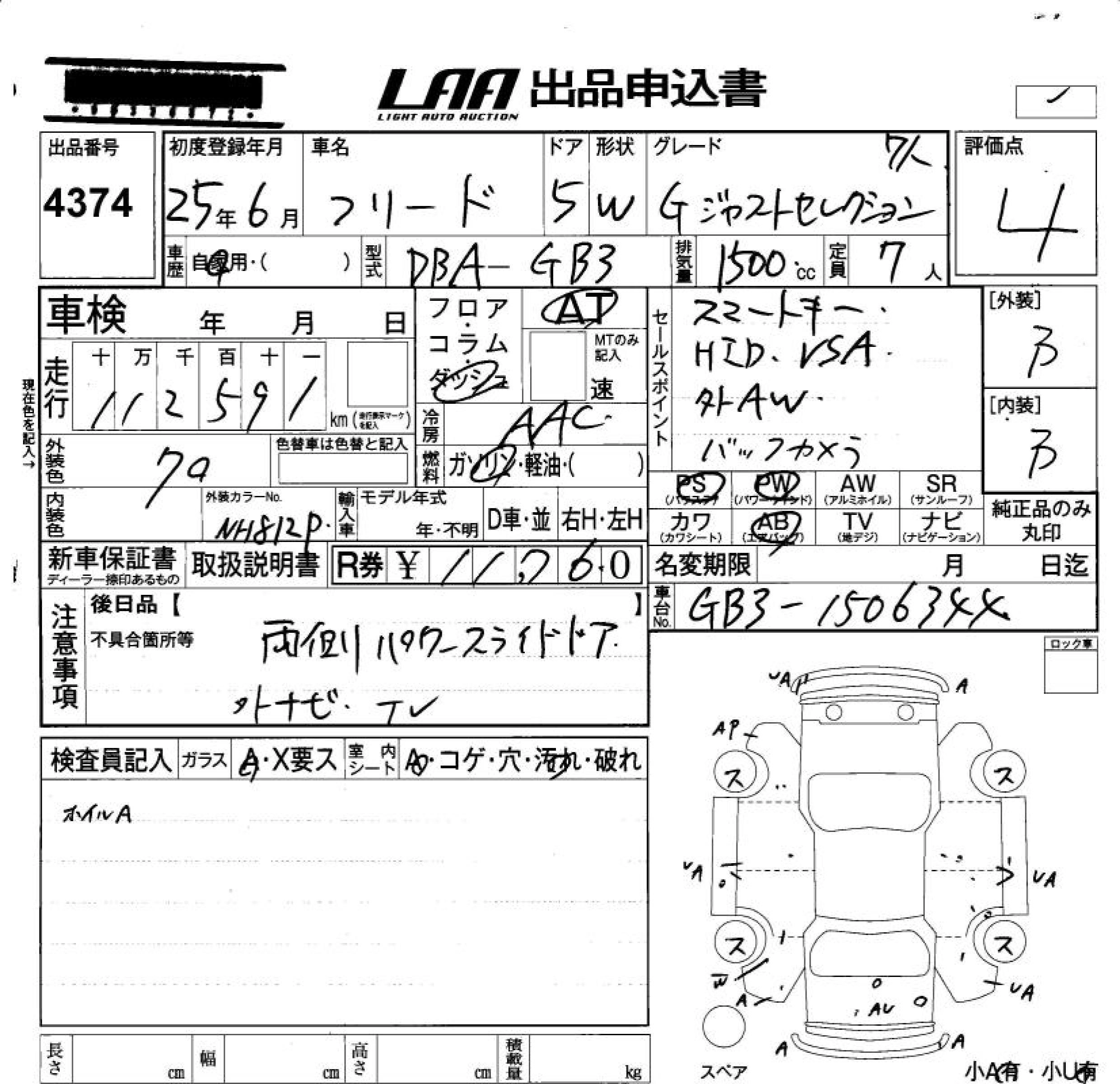 HONDA FREED 2013 г., лот № 4374