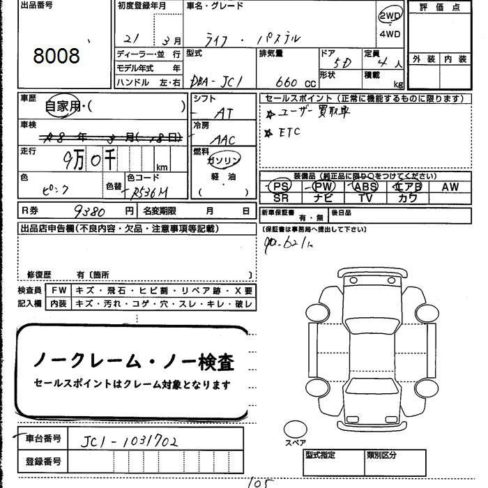 PASTEL DBA-JC1 P07A FF 4AT 658cc 52ps(38kW)/7100rpm AИ-92 1 144 500