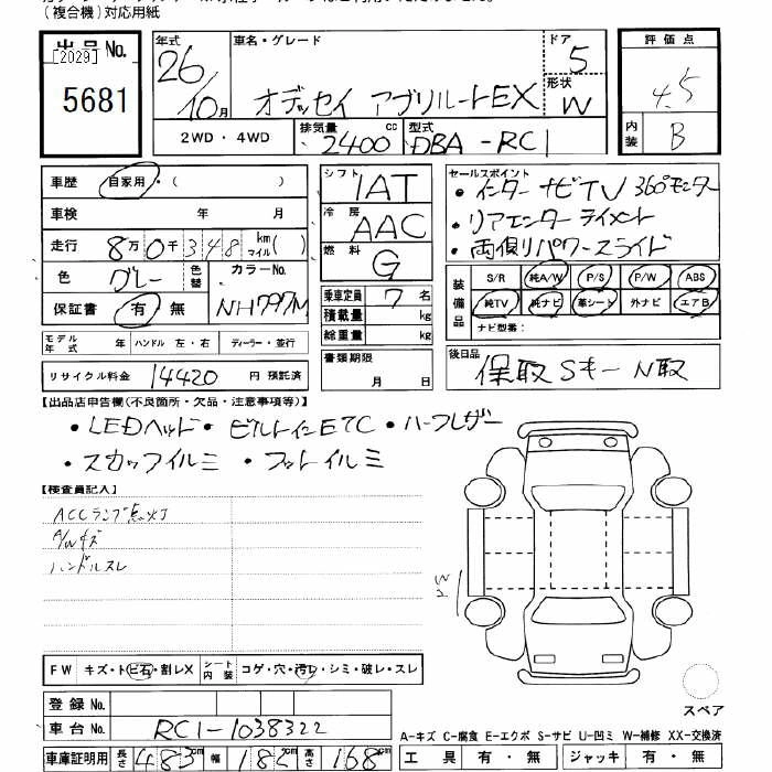 | G EX | DBA-RC1 | K24W | FF | CVT | 2356cc | 175ps(129kW)/6200rpm | AИ-92 | 3 275 485 | |