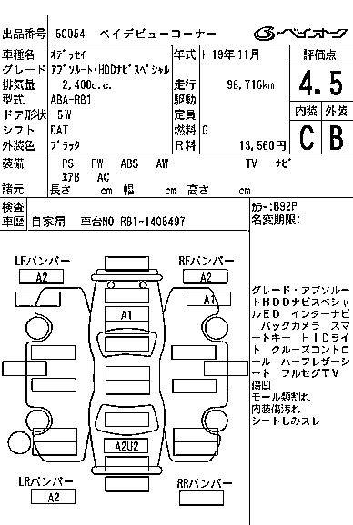| S | DBA-RB1 | K24A | FF | 5AT | 2354cc | 160ps(118kW)/5500rpm | AИ-92 | 2 362 500 | |