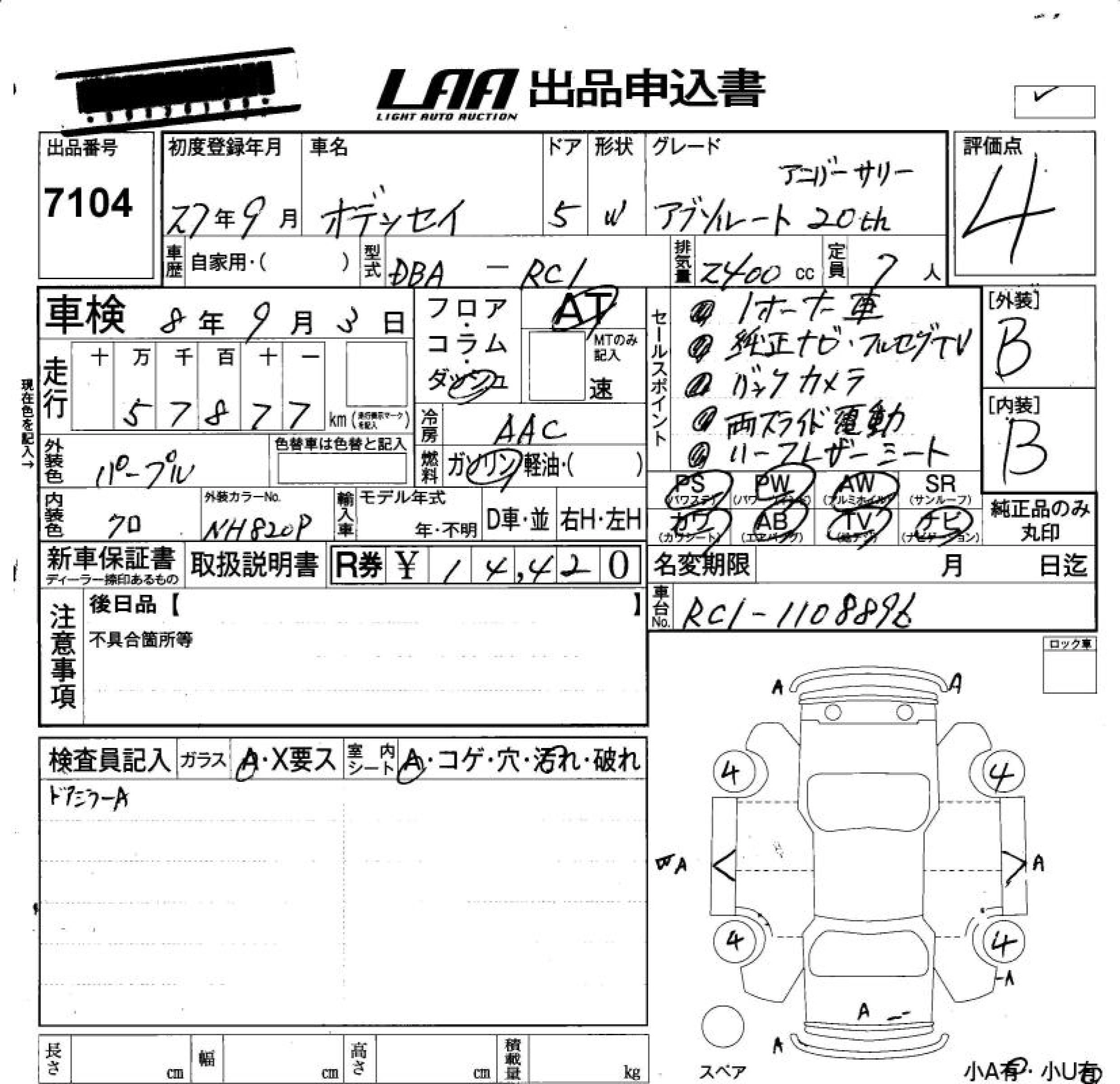 | ABSOLUTE 20TH ANNIVERSARY PACKAGE | DBA-RC2 | K24W | Full-time 4WD | CVT | 2356cc | 185ps(136kW)/6400rpm | AИ-92 | 3 607 400 | |