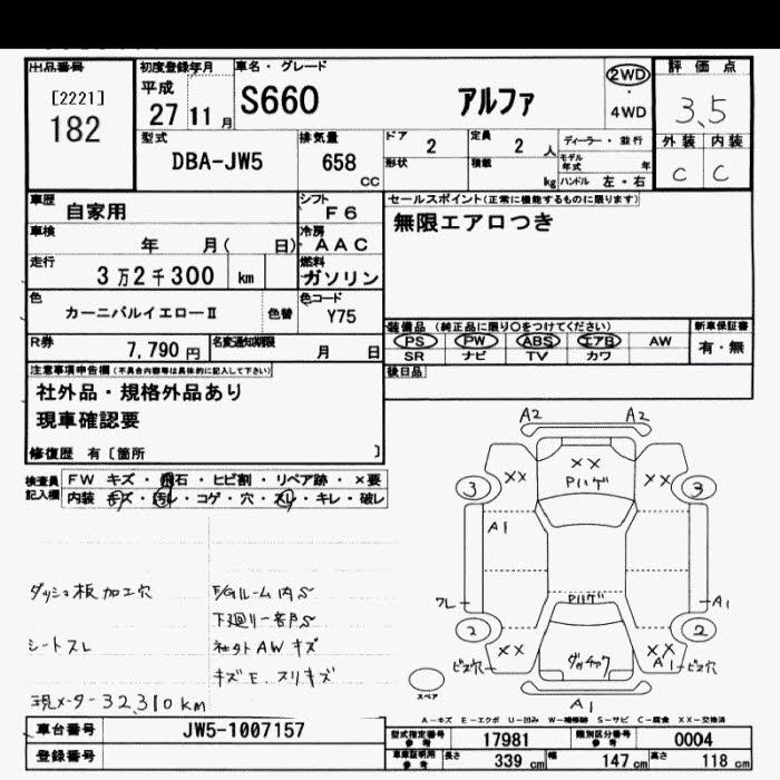 | ALPHA | DBA-JW5 | S07A | Mid-ship | 6MT | 658cc | 64ps(47kW)/6000rpm | AИ-92 | 2 180 000 | |
