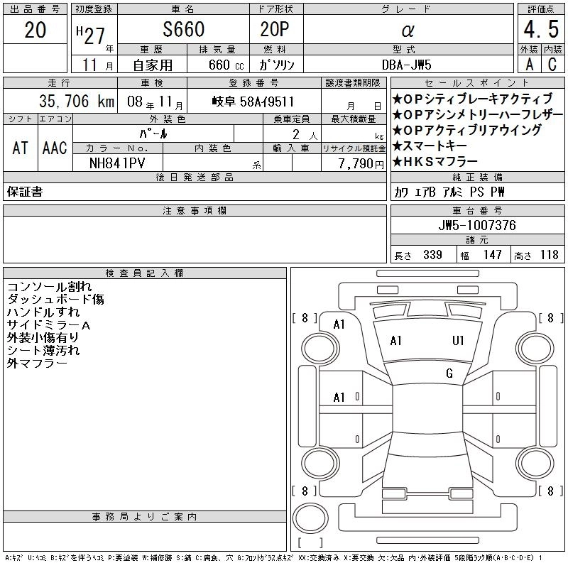 | ALPHA | DBA-JW5 | S07A | Mid-ship | 6MT | 658cc | 64ps(47kW)/6000rpm | AИ-92 | 2 180 000 | |