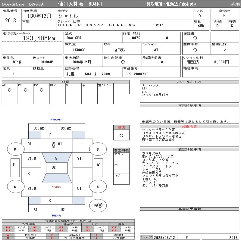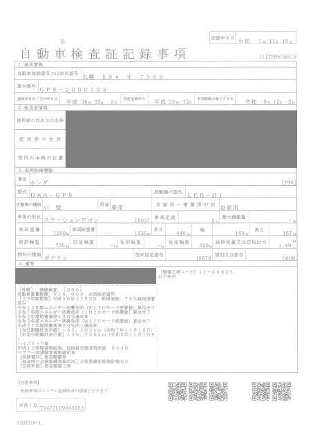 | G HONDA SENSING | DBA-GK8 | L15B | FF | CVT | 1496cc | 132ps(97kW)/6600rpm | AИ-92 | 1 770 120 |