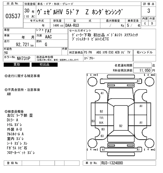 | G HONDA SENSING | DBA-RU1 | L15B | FF | CVT | 1496cc | 131ps(96kW)/6600rpm | AИ-92 | 2 075 000 | |