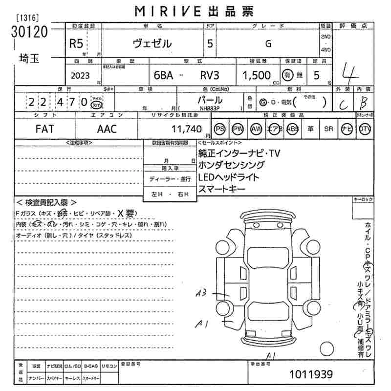 HONDA VEZEL 2023 г., лот № 30120