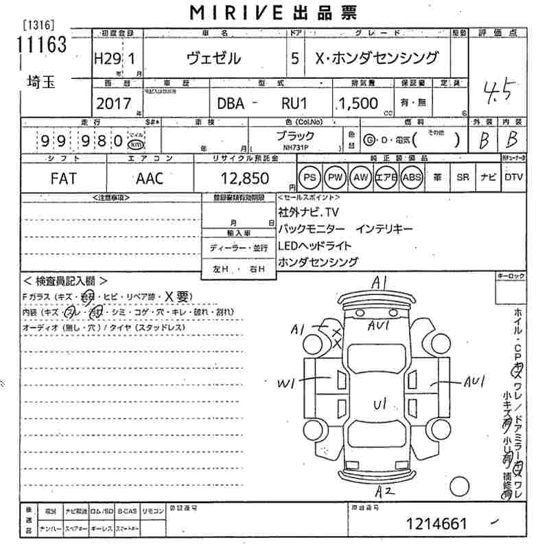 HONDA VEZEL 2017 г., лот № 11163