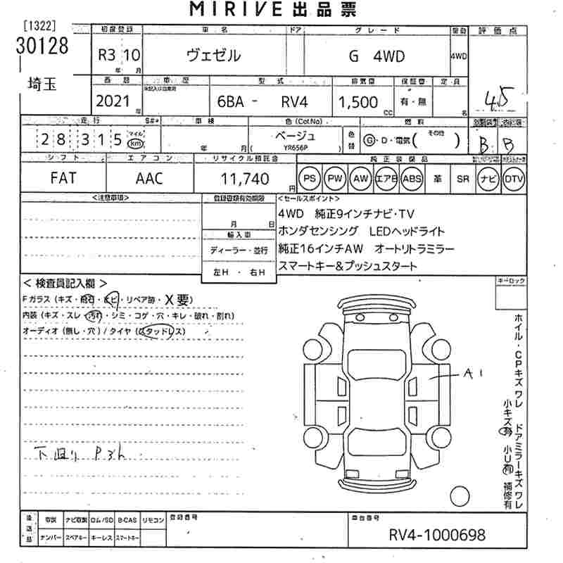 HONDA VEZEL 2021 г., лот № 30128