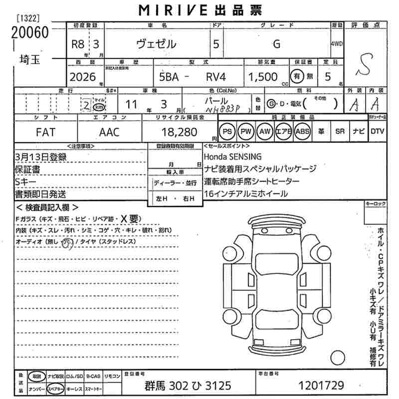 Статус продан Лот 20060 Аукцион MIRIVE Saitama Дата аукциона 18.03.2026