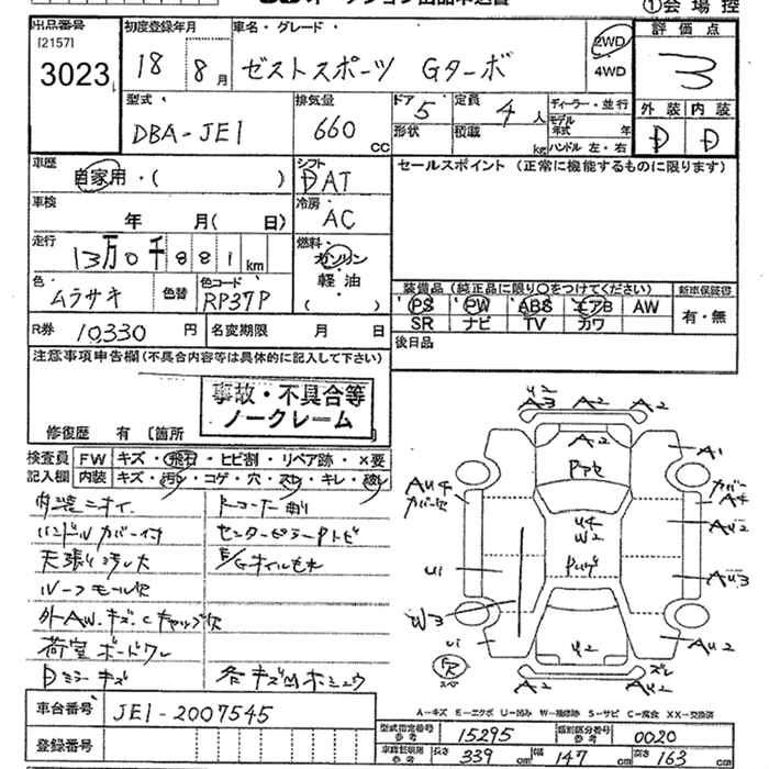 SPORTS W TURBO DBA-JE1 P07A FF 4AT 658cc 64ps(47kW)/6000rpm AИ-92 1 449 000