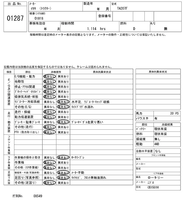 Статус выставлен на аукцион Лот 1287 Аукцион ARAI Kenki Дата аукциона 17.03.2026