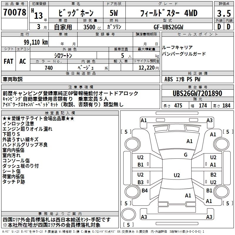 | FIELD STAR | TA-UBS26GW | 6VE1 | Part-time 4WD | 4AT | 3494cc | 230ps(169kW)/5600rpm | AИ-92 | 2 785 000 | |
