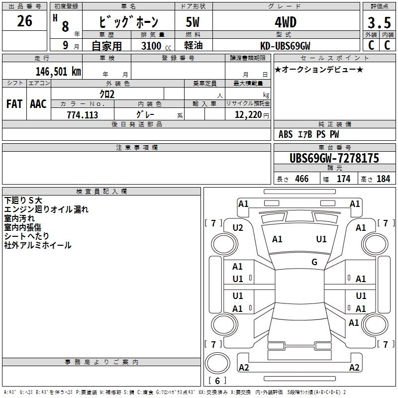 | XS-PLAISIR LIMITED | KD-UBS69GW | 4JG2 | Part-time 4WD | 4AT | 3059cc | 135ps(99kW)/3600rpm | Дизельное топливо | 2 780 000 |