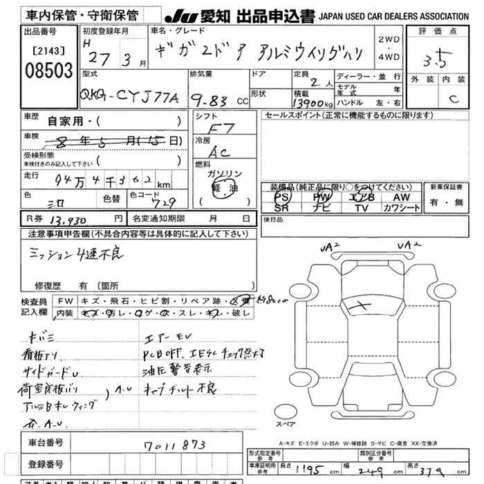 Год выпуска2015 Пробег 944 000 км КузовCYJ77A Комплектация ALUMINIUM WING 13.9T