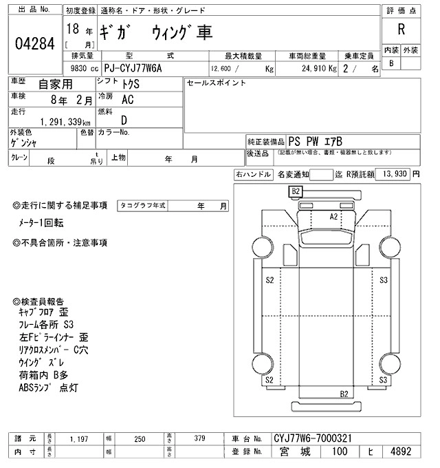 Год выпуска2006 Пробег 1 291 000 км КузовCYJ77W6A Комплектация WING