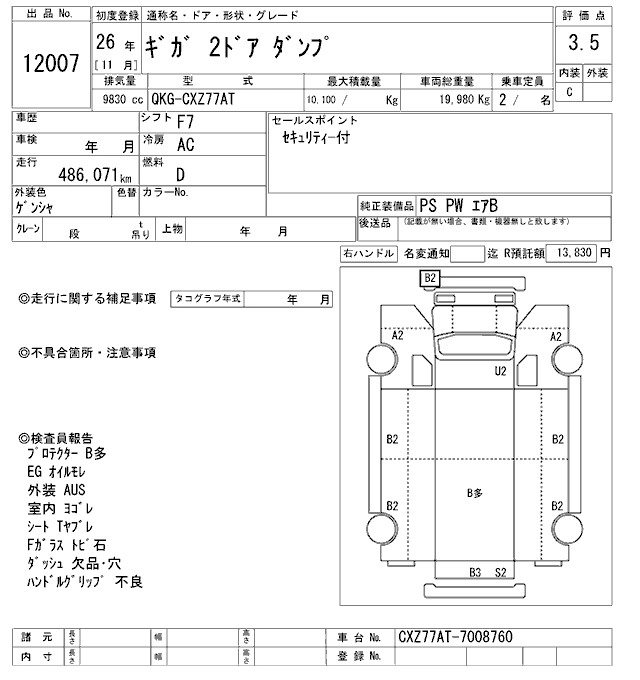 Год выпуска2014 Пробег 486 000 км КузовCXZ77AT Комплектация DUMP
