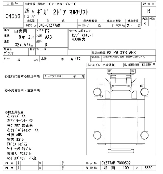 Год выпуска2013 Пробег 328 000 км КузовCYZ77AM Комплектация CONTAINER HEAD
