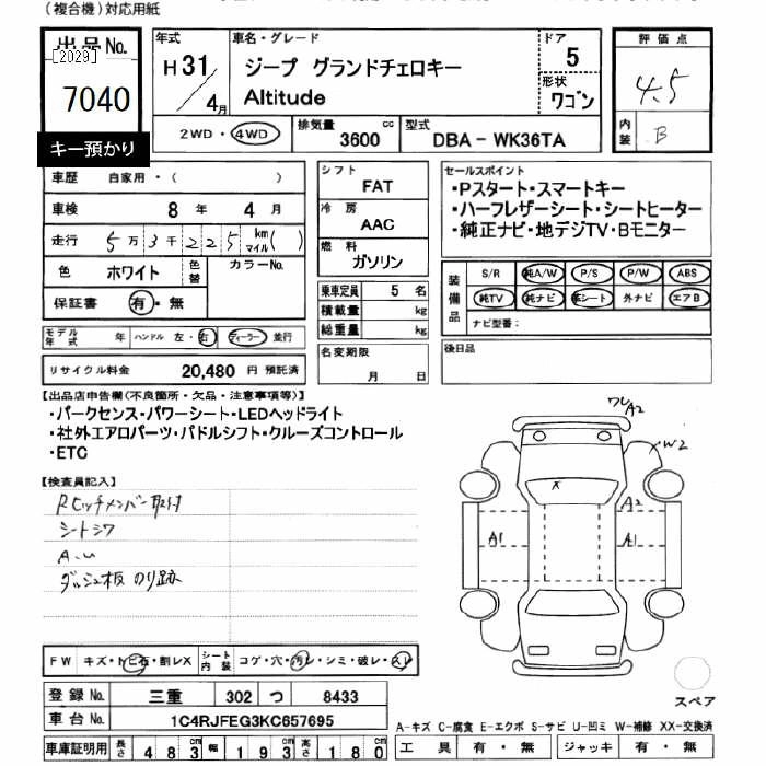 Год выпуска2019 Пробег 53 000 км КузовWK36TA Комплектация JEEP GRAND CHEROKEE -ALTITUDE 4WD