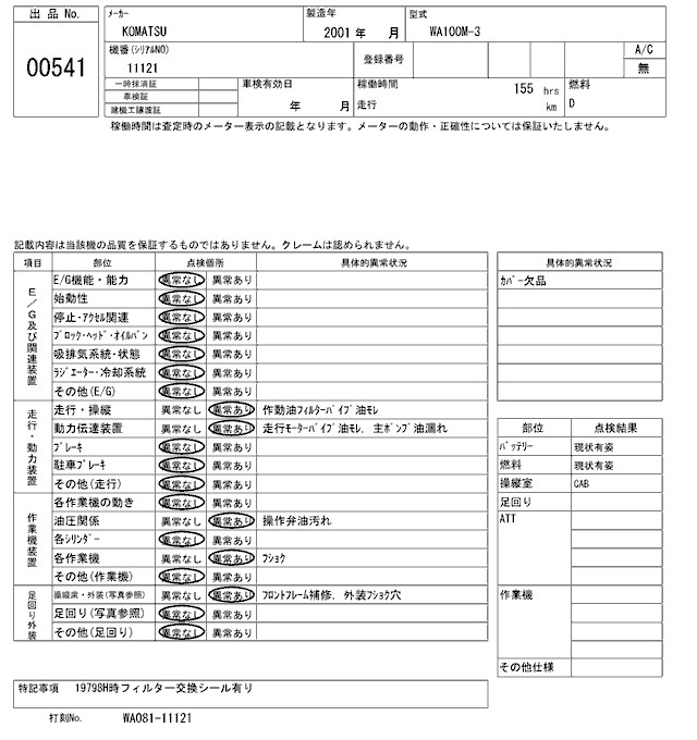 Год выпуска2001 КузовWA100M-3 Комплектация WHEEL LOADER -
