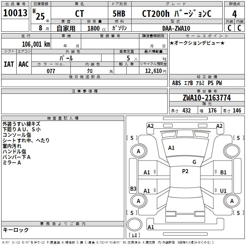 Год выпуска2013 Пробег 106 000 км КузовZWA10 КомплектацияCT200H VERSION C