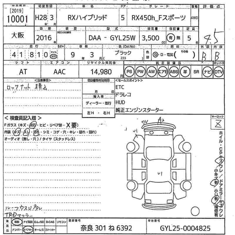Год выпуска2016 Пробег 42 000 км КузовGYL25W КомплектацияRX450H_F SPORT 4WD